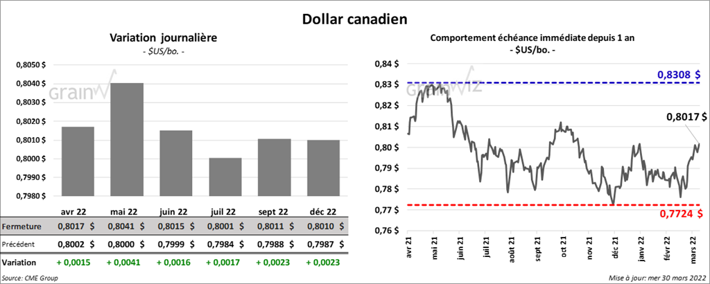 - Quant au rapport sur les stocks des grains US qui sera présenté jeudi, un sondage de Reuters indique que les analystes projettent qu’au 1er mars dernier, les inventaires de soya US ont été de 1,902 milliard de boisseaux, ce qui serait une augmentation de 21,8 % par rapport à l’an dernier.