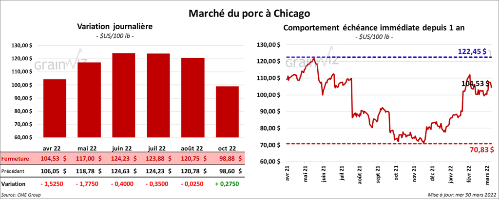 - Le 28 mars dernier, le CME Lean Hog Index était en hausse de 63 cents à 103,56 $.