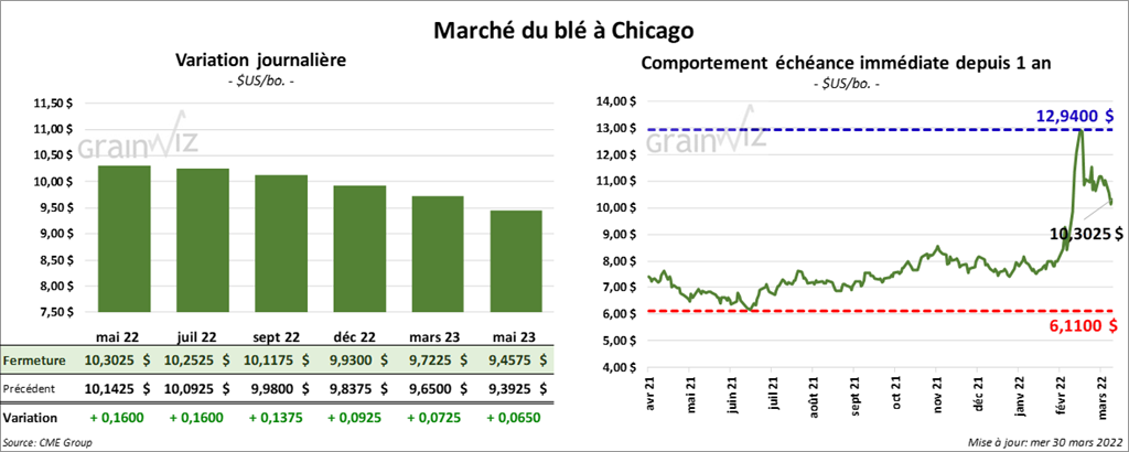 À Chicago, les contrats de blé aux échéances les plus rapprochées ont fini la séance en progression entre 13 ¾ et 16 cents. À Kansas, ceux de blé dur rouge aux échéances les plus rapprochées ont terminé en hausse entre 18 ¼ et 20 ½ cents. À Minneapolis, les contrats de blé de printemps aux échéances les plus rapprochées ont également clôturé dans le vert entre 14 ¼ et 15 cents.