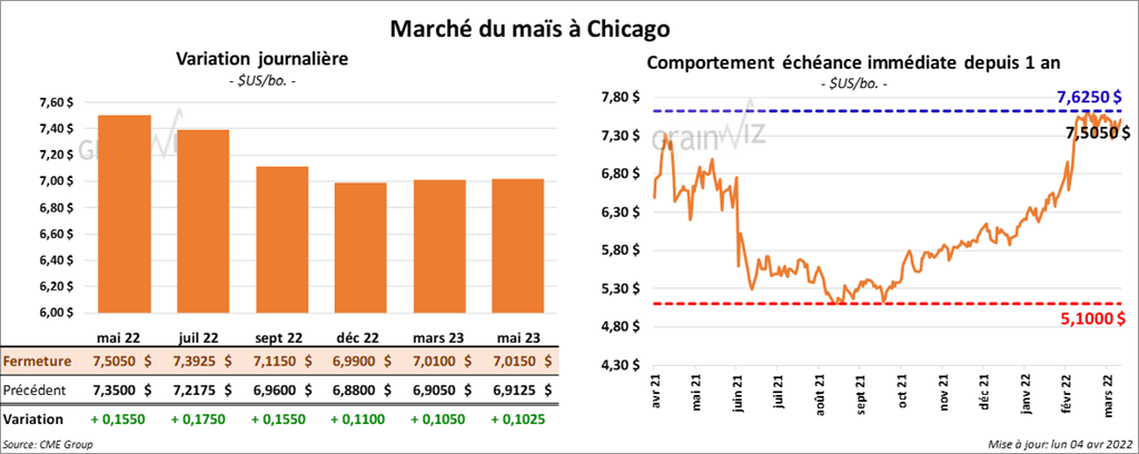 - Le premier rapport sur la progression des récoltes de 2022 a été publié cet après-midi. L’USDA estime qu’au 3 avril dernier, les semis de maïs US étaient terminés à 2 %, ce qui était le même résultat qu’au 3 avril 2021. La moyenne des 5 dernières années était également de 2 %.