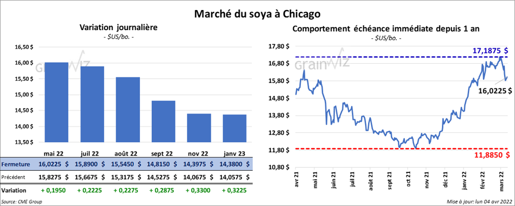 Les contrats de soya US aux échéances les plus rapprochées ont terminé la session en progression entre 19 ½ et 22 ¾ cents. Ceux de tourteau de soya US aux échéances les plus rapprochées ont fait de même en progressant entre 4,60 et 5,10 $/tonne. Les contrats d’huile de soya US aux échéances les plus rapprochées ont fermé dans le vert entre 111 et 114 points.