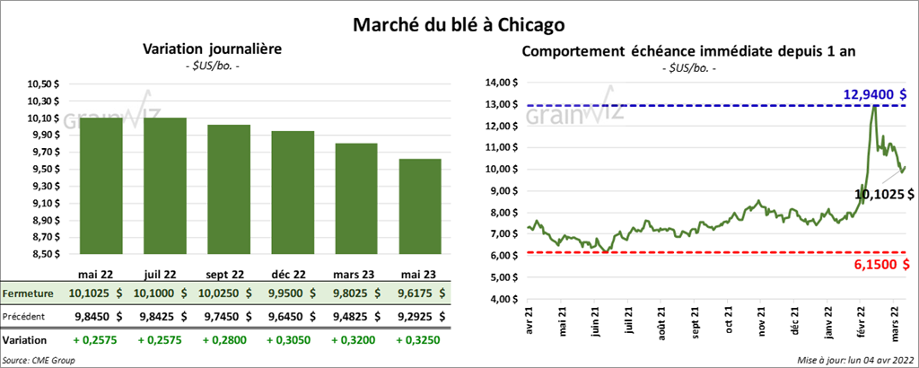 À Chicago, les contrats de blé aux échéances les plus rapprochées ont fini la journée en progression entre 25 ¾ et 28 cents. À Kansas, ceux de blé dur rouge aux échéances les plus rapprochées ont clôturé avec des gains entre 24 ¾ et 26 ½ cents. À Minneapolis, les contrats de blé de printemps aux échéances les plus rapprochées ont terminé en hausse entre 19 ½ et 19 ¾ cents.