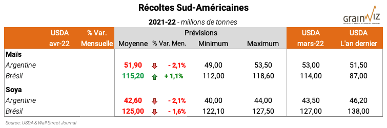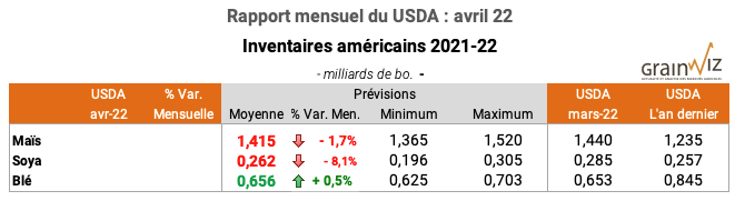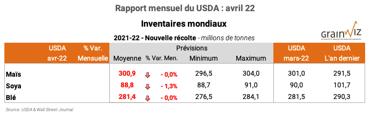 Le USDA présentera ce vendredi, à midi, son rapport mensuel d'offre et demande (WASDE) pour le mois d'avril. Avec les estimations des stocks de grains aux États-Unis au 1er mars dernier, les marchés anticipent des réductions des inventaires de fin d'année de maïs et soya aux États-Unis, mais une hausse de ceux de blé.