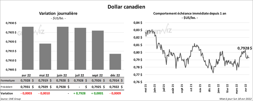 - Le rapport sur la progression des cultures montre qu’au 17 avril dernier, 7 % du blé d’hiver US étaient en épiaison comparativement à 9 % l’an passé et 12 % pour la moyenne quinquennale. Les conditions de cultures se sont détériorées de 2 % par rapport à la semaine précédente à 30 % dans les catégories «bon à excellent». De plus, 37 % des plants étaient dans les catégories «pauvre à très pauvre», ce qui était une hausse de 1 % comparativement à la semaine précédente. Les conditions sèches dans le centre et le sud des Plaines US sont probablement responsables de la détérioration des plants de blé d’hiver US. Par ailleurs, les ensemencements de blé de printemps US ont été terminés à 8 %, ce qui était un retard de 10 % par rapport à l’an dernier. La moyenne des 5 dernières années était de 9 %.
