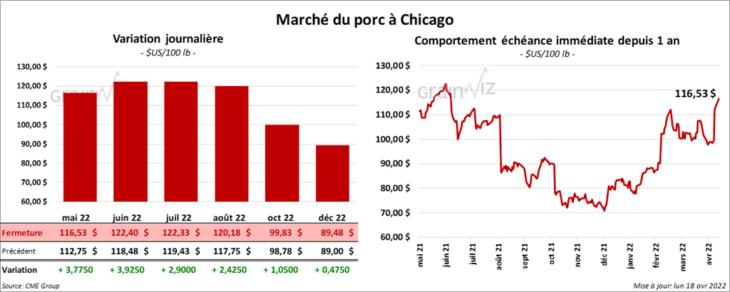 - Le 14 avril dernier, le CME Lean Hog Index était en progression de 79 cents à 99,98 $.