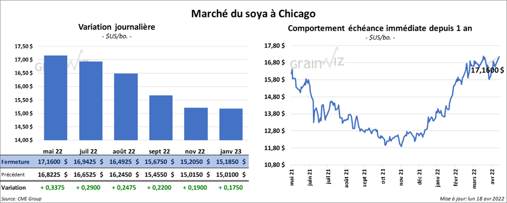 Les contrats de soya US aux échéances les plus rapprochées ont terminé la séance en hausse entre 24 ¾ et 33 ¾ cents. Ceux de tourteau de soya US aux échéances les plus rapprochées ont également fermé dans le vert de 4,60 $/tonne. Les contrats d’huile de soya US aux échéances les plus rapprochées ont fini en hausse entre 108 et 120 points.