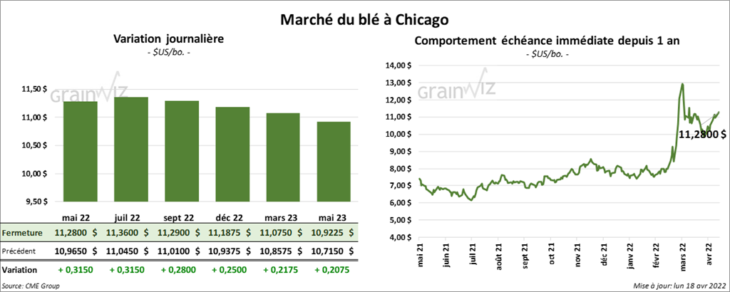 - CFTC : Le 12 avril dernier, à Chicago, les spéculateurs avaient augmenté leurs positions dans le blé de 9,7 % à 49,392 contrats. Le minimum des 52 dernières semaines était de 14,852 contrats et le maximum de 65,609 contrats. À Minneapolis, ils avaient fait l’inverse en réduisant leurs positions de 0,7 % à 18,120 contrats. Le minimum des 52 dernières semaines était de 3,340 contrats et le maximum de 18,255 contrats.