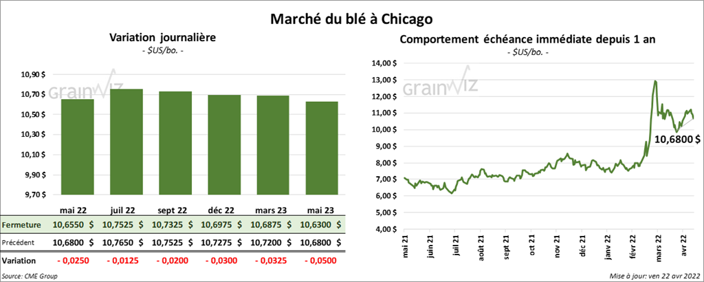 - FranceAgriMer estime qu’en date du 18 avril dernier, 91 % du blé français se trouvaient dans les catégories «bon à excellent», ce qui était une baisse de 1 % comparativement à la semaine précédente.