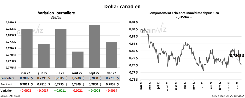 Les contrats de soya US aux échéances les plus rapprochées ont clôturé avec des gains entre 1 ¾ et 2 ½ cents. Celui juillet 22 a fait exception en finissant au neutre. Les contrats de tourteau de soya US aux échéances les plus rapprochées ont terminé la journée en progression entre 30 cents et 2,20 $/tonne. Les contrats d’huile de soya US aux échéances les plus rapprochées ont fait l’inverse en finissant en baisse entre 143 et 242 points.