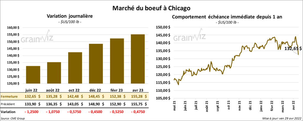 - Le 28 avril dernier, le CME Feeder Cattle Index était en baisse de 72 cents à 155,64 $.