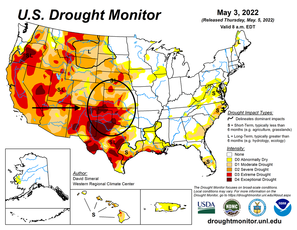 - Cette carte pour le 3 mai dernier montre la sécheresse dans le sud des Plaines US.