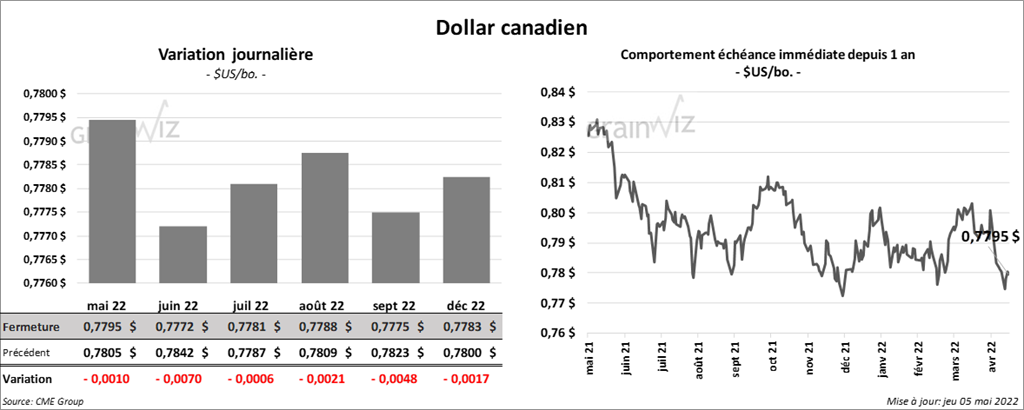 - Pour demain, les analystes s’attendent à ce que Statistique Canada mentionne que vers la fin mars dernier, les stocks blé canadien ont été de 10,4 millions de tonnes, ce qui serait une baisse annuelle de 36 %. Dans le cas du blé durum canadien, les inventaires sont anticipés à 1,363 million de tonnes. En 2021, ils étaient de 2,753 millions de tonnes.