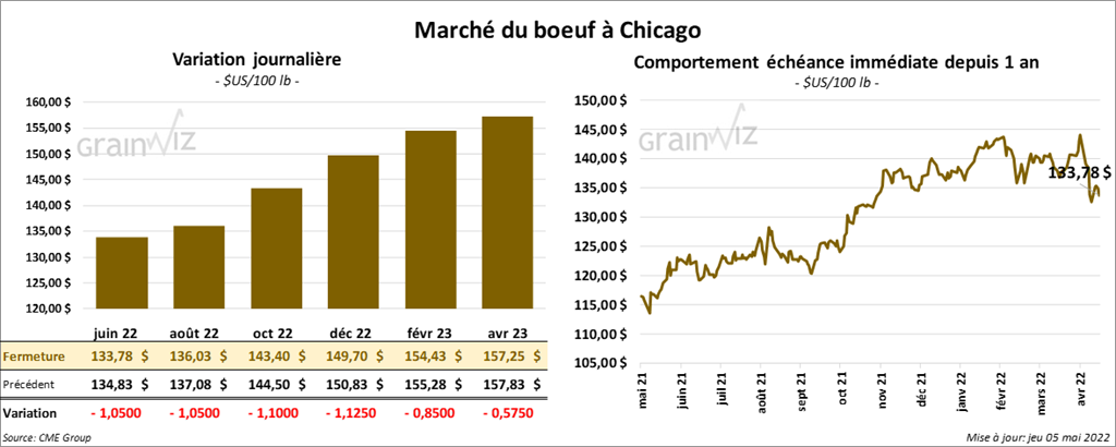 Les contrats de bœuf US aux échéances les plus rapprochées ont fini la journée en baisse entre 1,05 et 1,10 $. Ceux de veau US aux échéances les plus rapprochées ont aussi terminé avec des pertes entre 1,20 et 1,92 $.