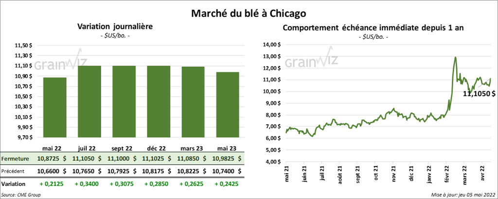 - Au cours de la semaine du 28 avril dernier, les ventes à l’exportation de blé US 2021/22 ont été de 118,800 tonnes, ce qui était une augmentation notable comparativement à la semaine précédente et une hausse de 53 % par rapport à la moyenne des 4 dernières semaines. Le Mexique et les Philippines ont été les plus gros acheteurs. Pour 2022/23, les ventes à l’exportation ont été de 42,400 tonnes. Le Mexique et la République dominicaine ont été les principaux acheteurs. Les attentes des analystes étaient entre 100,000 et 450,000 tonnes.