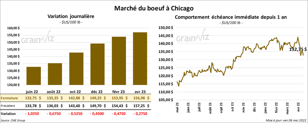 Les contrats de bœuf US aux échéances les plus rapprochées ont terminé la séance en baisse entre 52 cents et 1,02 $. Ceux de veau US aux échéances les plus rapprochées ont fini avec des gains entre 32 et 50 cents. Celui mai 22 a fait exception en clôturant en baisse de 77 cents.