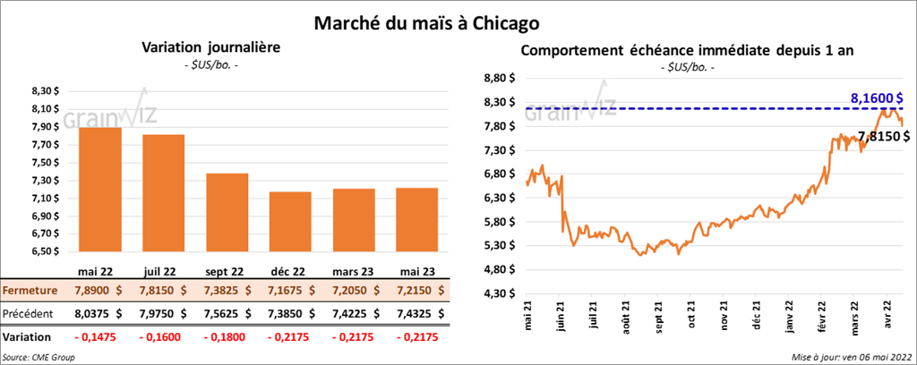 Les contrats de maïs US aux échéances les plus rapprochées ont clôturé en baisse entre 14 ¾ et 18 cents.