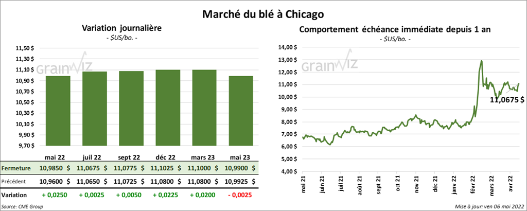 À Chicago, les contrats de blé aux échéances les plus rapprochées ont fini la session en progression entre ¼ et ½ cent. À Kansas, ceux de blé dur rouge aux échéances les plus rapprochées ont terminé avec des pertes de 6 ¼ cents. Celui mai 22 a fait exception en fermant en hausse de 15 ¼ cents. À Minneapolis, les contrats de blé de printemps aux échéances les plus rapprochées ont clôturé en hausse entre 1 ¼ et 31 cents.