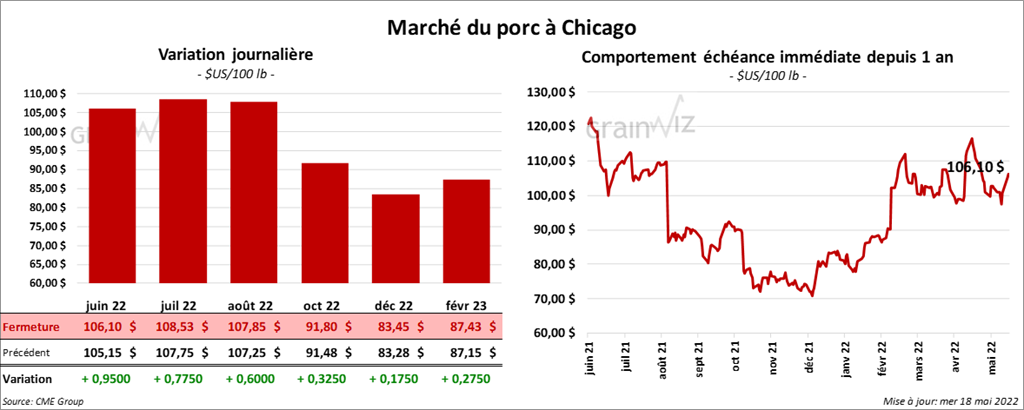 - Le 16 mai dernier, le CME Lean Hog Index était en baisse de 17 cents à 99,90 $.