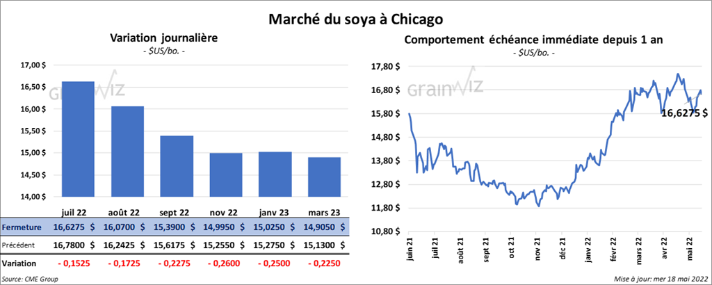 Les contrats de soya US aux échéances les plus rapprochées ont terminé la journée en baisse entre 15 ¼ et 22 ¾ cents. Ceux de tourteau de soya US aux échéances les plus rapprochées ont fini quelque part entre une hausse de 1,70 $/tonne et une baisse de 60 cents/tonne. Les contrats d’huile de soya US aux échéances les plus rapprochées ont fermé dans le rouge entre 249 et 294 points.