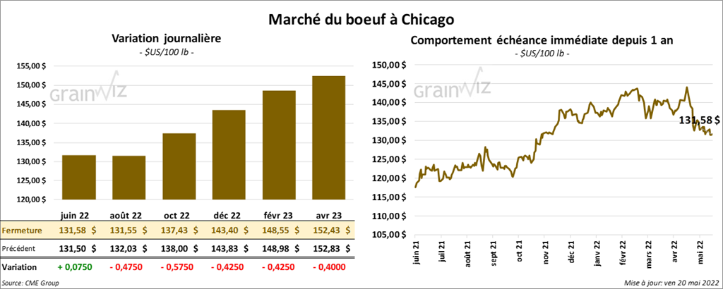 Les contrats de bœuf US aux échéances les plus rapprochées ont clôturé en baisse entre 47 et 57 cents. Celui juin 22 a fait exception en fermant en hausse de 7 cents. Les contrats de veau US aux échéances les plus rapprochées ont fini en recul entre 72 cents et 1,27 $.