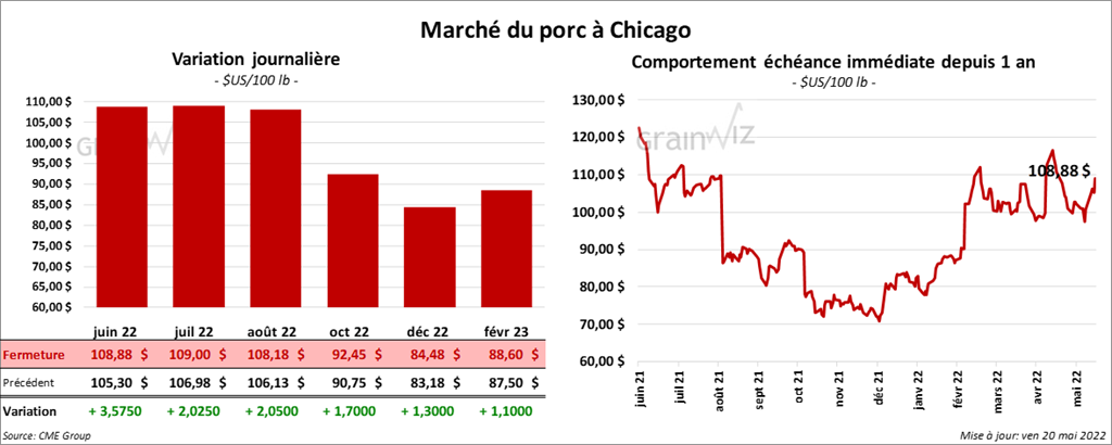 - Le 18 mai dernier, le CME Lean Hog Index était en hausse de 29 cents à 100,37 $.