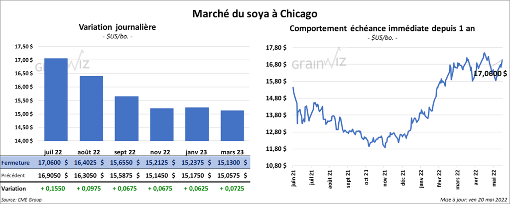 Les contrats de soya US aux échéances les plus rapprochées ont terminé la session en hausse entre 6 ¾ et 15 ½ cents. Ceux de tourteau de soya US aux échéances les plus rapprochées ont fini en hausse entre 2,20 et 3,90 $/tonne. Les contrats d’huile de soya US aux échéances les plus rapprochées ont également fermé dans le vert entre 80 et 140 points.