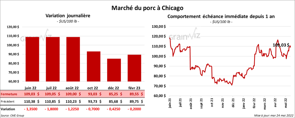 - Le 20 mai dernier, le CME Lean Hog Index était en progression de 91 cents à 102,08 $.