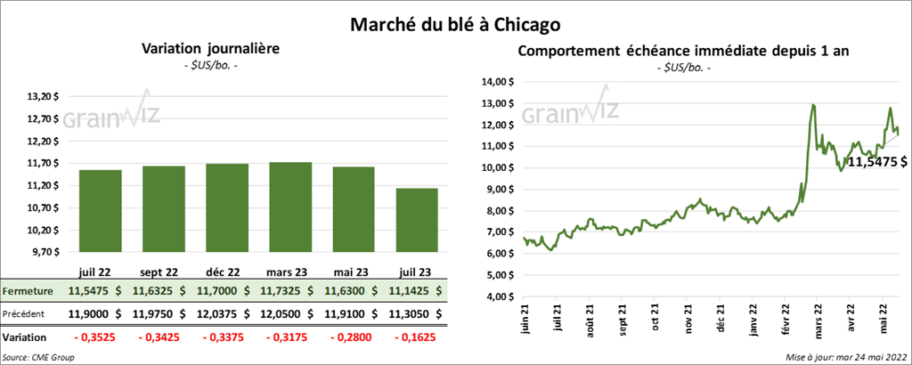 À Chicago, les contrats de blé aux échéances les plus rapprochées ont fermé en baisse entre 33 ¾ et 35 ¼ cents. À Kansas, les contrats de blé dur rouge ont également fini avec des pertes entre 37 ½ et 38 ¾ cents. À Minneapolis, les contrats de blé de printemps US aux échéances les plus rapprochées ont clôturé en recul entre 20 ½ et 21 ¼ cents.