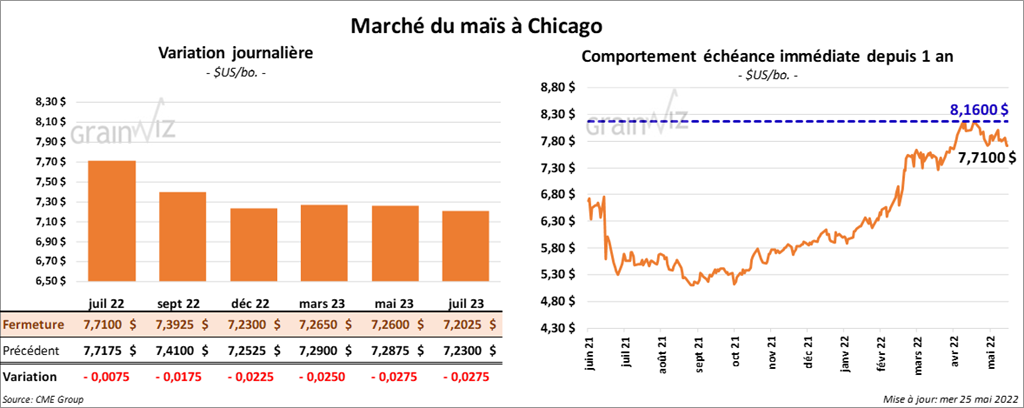 Les contrats de maïs US aux échéances les plus rapprochées ont clôturé avec des pertes entre ¾ et 2 ¼ cents.