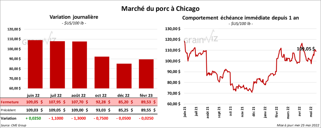 Les contrats de porc US aux échéances les plus rapprochées ont fermé en baisse entre 1,10 et 1,30 $. Celui juin 22 a fait exception en finissant en hausse de 2 cents.