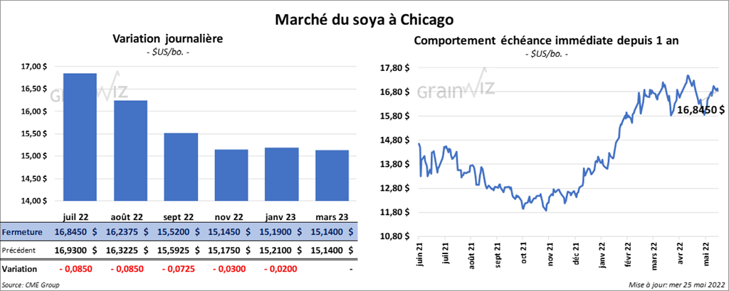 Les contrats de soya US aux échéances les plus rapprochées ont terminé la journée en baisse entre 7 ¼ et 8 ½ cents. Ceux de tourteau de soya US aux échéances les plus rapprochées ont également fermé dans le rouge entre 2,30 et 3,10 $/tonne. Les contrats d’huile de soya US aux échéances les plus rapprochées ont fini la session en recul entre 98 et 136 points.