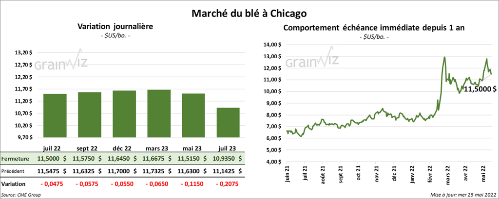 À Chicago, les contrats de blé aux échéances les plus rapprochées ont terminé en baisse entre 4 ¾ et 5 ¾ cents. À Kansas, ceux de blé dur rouge aux échéances les plus rapprochées ont également fini la journée en recul entre 3 et 4 ½ cents. À Minneapolis, les contrats de blé de printemps aux échéances les plus rapprochées ont fait l’inverse en clôturant en progression entre 4 ¾ et 8 cents.