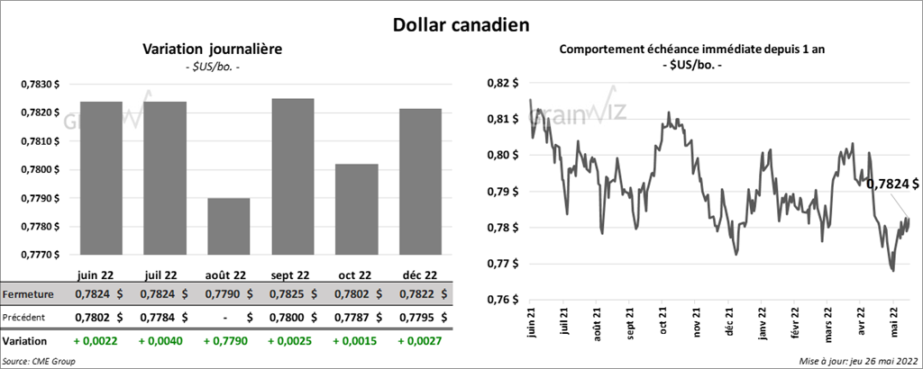 - Au cours de la semaine du 19 mai dernier, les ventes à l’exportation de maïs US 2021/22 ont été de 151,600 tonnes, ce qui était un creux de l’année commerciale, une baisse de 63 % comparativement à la semaine précédente et une réduction de 73 % par rapport à la moyenne des 4 dernières semaines. Le Japon et la Colombie ont été les principaux acheteurs. Les attentes des analystes étaient entre 150,000 et 500,000 tonnes. Pour 2022/23, les ventes à l’exportation ont été de 58,300 tonnes. Les destinations inconnues et le Costa Rica ont été les plus gros acheteurs. Les anticipations des analystes étaient entre 200,000 et 800,000 tonnes.