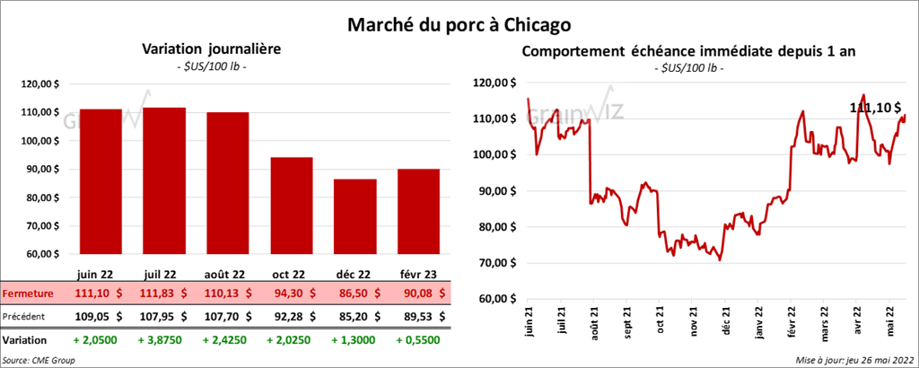 - Le 24 mai dernier, le CME Lean Hog Index était en hausse de 84 cents à 103,87 $.