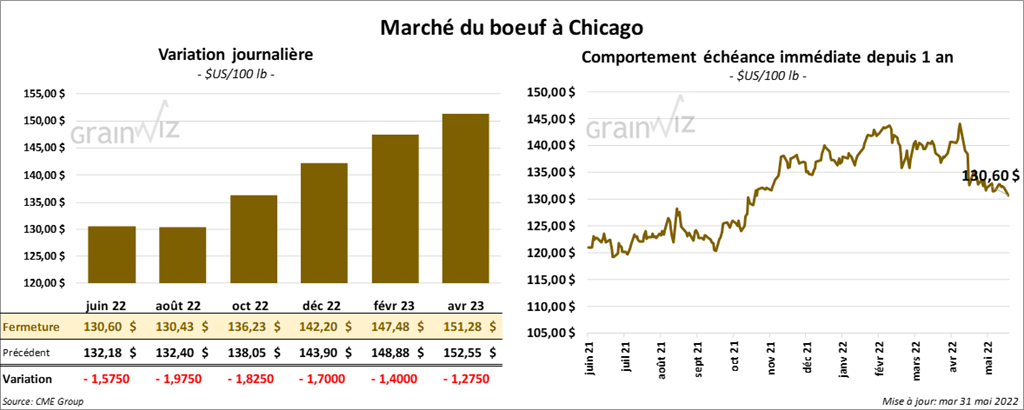 - Le 30 mai dernier, le CME Feeder Cattle Index était en baisse de 1,50 $ à 153,22 $.