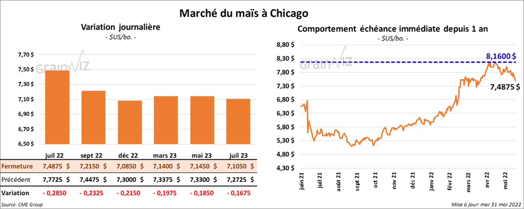 Les contrats de maïs US aux échéances les plus rapprochées ont terminé la journée en baisse entre 21 ½ et 28 ½ cents.