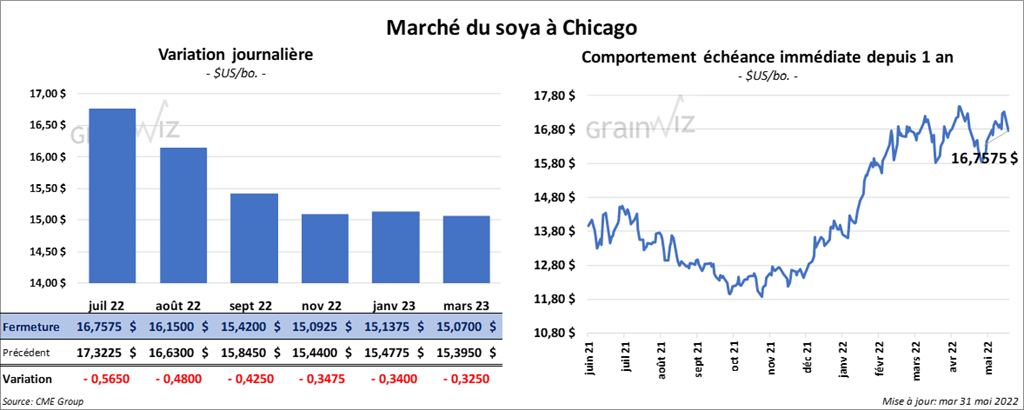 Les contrats de soya US aux échéances les plus rapprochées ont clôturé avec des pertes entre 42 ½ et 56 ½ cents. Ceux de tourteau de soya US aux échéances les plus rapprochées ont également fini la session en baisse entre 14,70 et 17,50 $/tonne. Les contrats d’huile de soya US aux échéances les plus rapprochées ont terminé en recul entre 111 et 165 points.