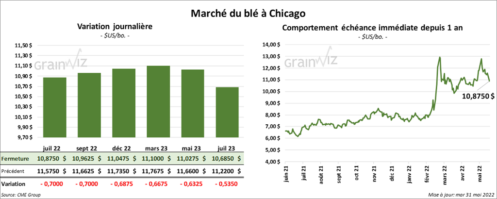 - SovEcon anticipe que la Russie aura exporté 1 million de tonnes de blé en mai, ce qui est presque la moitié moins qu’en avril, mais plus du double comparativement à mai 2021.