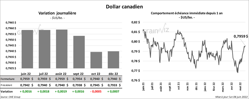 - Concernant le rapport sur la progression des cultures, l’USDA estime qu’hier, 79 % des plants de blé d’hiver US étaient en épiaison, ce qui était des retards de 5 % par rapport à l’an passé et comparativement à la moyenne des 5 dernières années. Par contre, la récolte a été finalisée à 5 % contre 2 % l’an dernier et 6 % pour la moyenne des 5 dernières années. Les analystes s’attendaient à ce que la récolte soit terminée à 6 %. De plus, comparativement à la semaine précédente, l’USDA a estimé que les conditions sont passées de 29 % à 30 % dans les catégories «bon à excellent». Les analystes prévoyaient aussi une amélioration de 1 % à 30 % dans les mêmes catégories. Toutefois, les conditions sont demeurées les mêmes à 30 % dans les catégories «pauvre à très pauvre». L’USDA a également noté que les ensemencements de blé de printemps US ont été terminés à 82 %, ce qui représentait un retard de 17 % par rapport à l’an dernier. La moyenne des 5 dernières années était de 97 %. Les analystes prévoyaient que les semis seraient terminés à 85 %. Par ailleurs, 55 % des plants avaient émergé comparativement à 89 % l’an dernier et 83 % pour la moyenne des 5 dernières années.