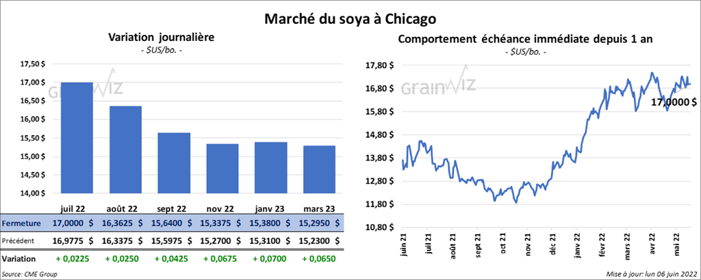 Les contrats de soya US aux échéances les plus rapprochées ont fini la session en hausse entre 2 ¼ et 4 ¼ cents. Ceux de tourteau de soya US aux échéances les plus rapprochées ont également fermé en progression entre 30 et 80 cents/tonne. Celui juillet 22 a fait exception en terminant en baisse de 60 cents/tonne. Les contrats d’huile de soya US aux échéances les plus rapprochées ont clôturé en baisse entre 5 et 67 points.