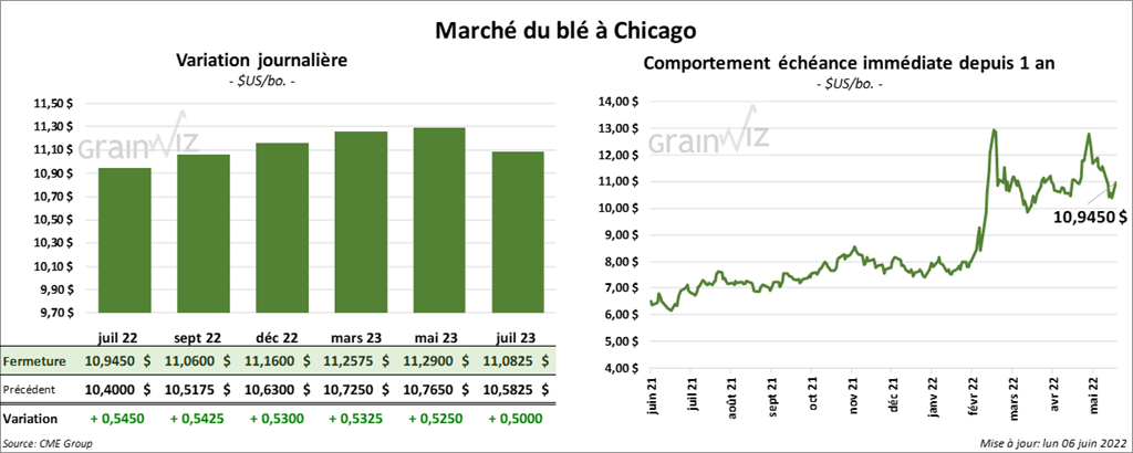 À Chicago, les contrats de blé aux échéances les plus rapprochées ont terminé en progression entre 53 et 54 ½ cents. À Kansas, ceux de blé dur rouge aux échéances les plus rapprochées ont fini en hausse entre 49 et 49 ¾ cents. À Minneapolis, les contrats de blé de printemps aux échéances les plus rapprochées ont également clôturé avec des gains entre 35 et 37 ½ cents.