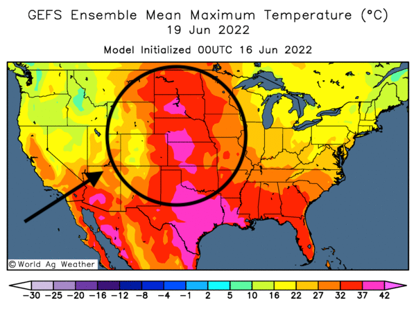 - Selon World Weather, la chaleur extrême devrait se poursuivre demain pour se prolonger ce week-end dans les Plaines US et l’ouest du Corn Belt. Des températures proches des 38 degrés Celsius sont donc attendues par les météorologues, en particulier pour les États du Dakota du Nord et du Sud et celui du Minnesota. Pour l’instant du moins, l’humidité du sol semble bonne dans l’ensemble, mais les averses limitées et les températures élevées prévues la semaine prochaine pourraient toutefois occasionner un certain stress aux jeunes pousses de maïs et de soya qui se trouvent dans les Plaines US et l’ouest du Corn Belt.
