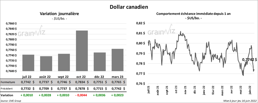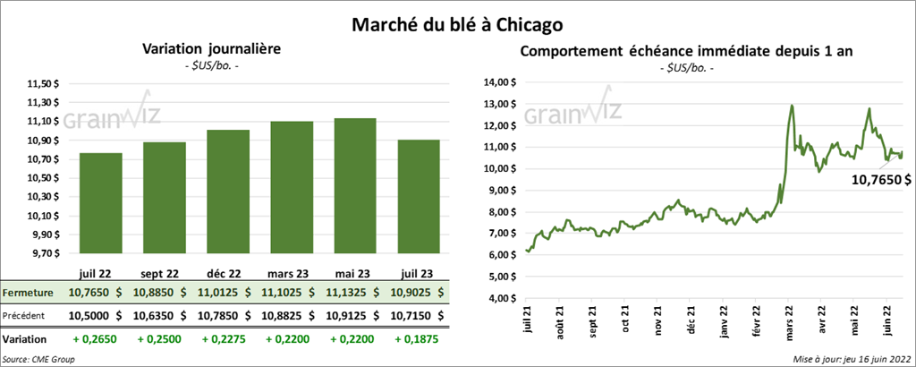 - Pour les ventes à l’exportation de la semaine du 9 juin dernier, celles de blé US 2022/23 ont été de 236,900 tonnes. Le Brésil et le Mexique ont été les plus gros acheteurs. Les projections des analystes étaient entre 200,000 et 600,000 tonnes.