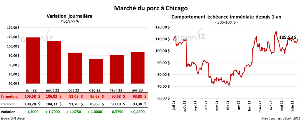- Le 14 juin dernier, le CME Lean Hog Index était en hausse de 44 cents à 108,57 $.