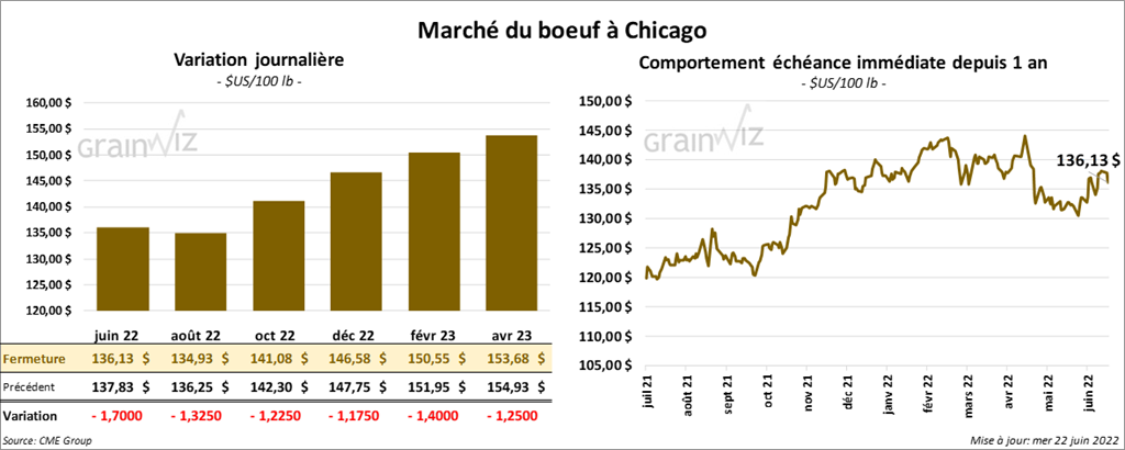 Les contrats de bœuf US aux échéances les plus rapprochées ont clôturé en baisse entre 1,22 et 1,70 $. Ceux de veau US aux échéances les plus rapprochées ont aussi fini la séance dans le rouge entre 1,67 et 2,15 $.