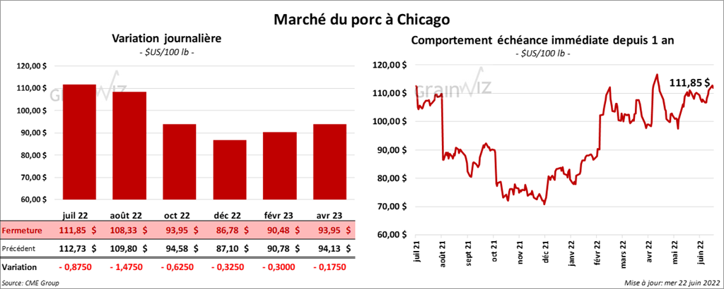 - Le 20 juin dernier, le CME Lean Hog Index était en hausse de 1,29 $ à 110,45 $.