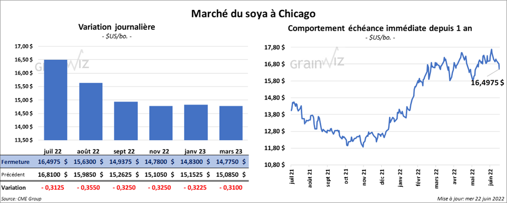 Les contrats de soya US aux échéances les plus rapprochées ont terminé la journée en baisse entre 31 ¼ et 35 ½ cents. Ceux de tourteau de soya US aux échéances les plus rapprochées ont également clôturé en recul entre 90 et 10 cents/tonne. Celui juillet 22 a fait exception en terminant en hausse de 1,50 $/tonne. Les contrats d’huile de soya US aux échéances les plus rapprochées ont également fini dans le rouge entre 259 et 273 points.