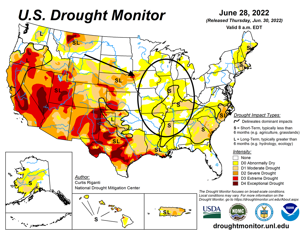 - Cette carte US montre certaines zones sèches pour le Midwest et le sud US dans la journée du 28 juin dernier.