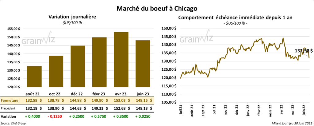 Les contrats de bœuf US aux échéances les plus rapprochées ont fermé avec des gains entre 25 et 40 cents. Celui octobre 22 a fait exception en terminant en baisse de 12 cents. Les contrats de veau US aux échéances les plus rapprochées ont clôturé en progression entre 2,27 et 2,87 $.