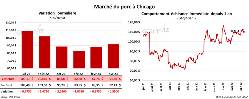 - Le 28 juin dernier, le CME Lean Hog Index était en baisse de 38 cents à 111,26 $.